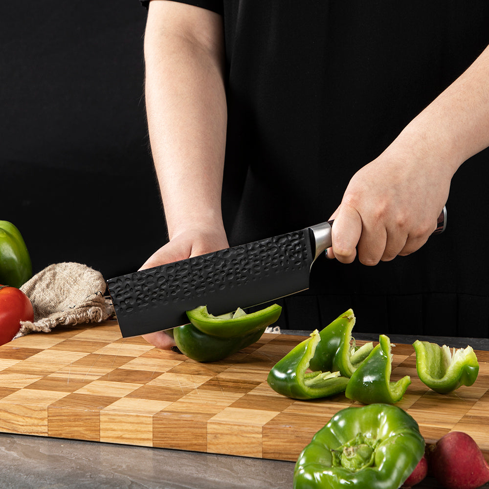 Designed for chopping vegetables, the Nakiri knife's straight blade allows for clean, straight cuts and quick chopping. Crafted with a high-quality stainless steel 4Cr13 blade for durability and sharp edge retention. The Pakka wood handle provides a comfortable grip and elegant look.